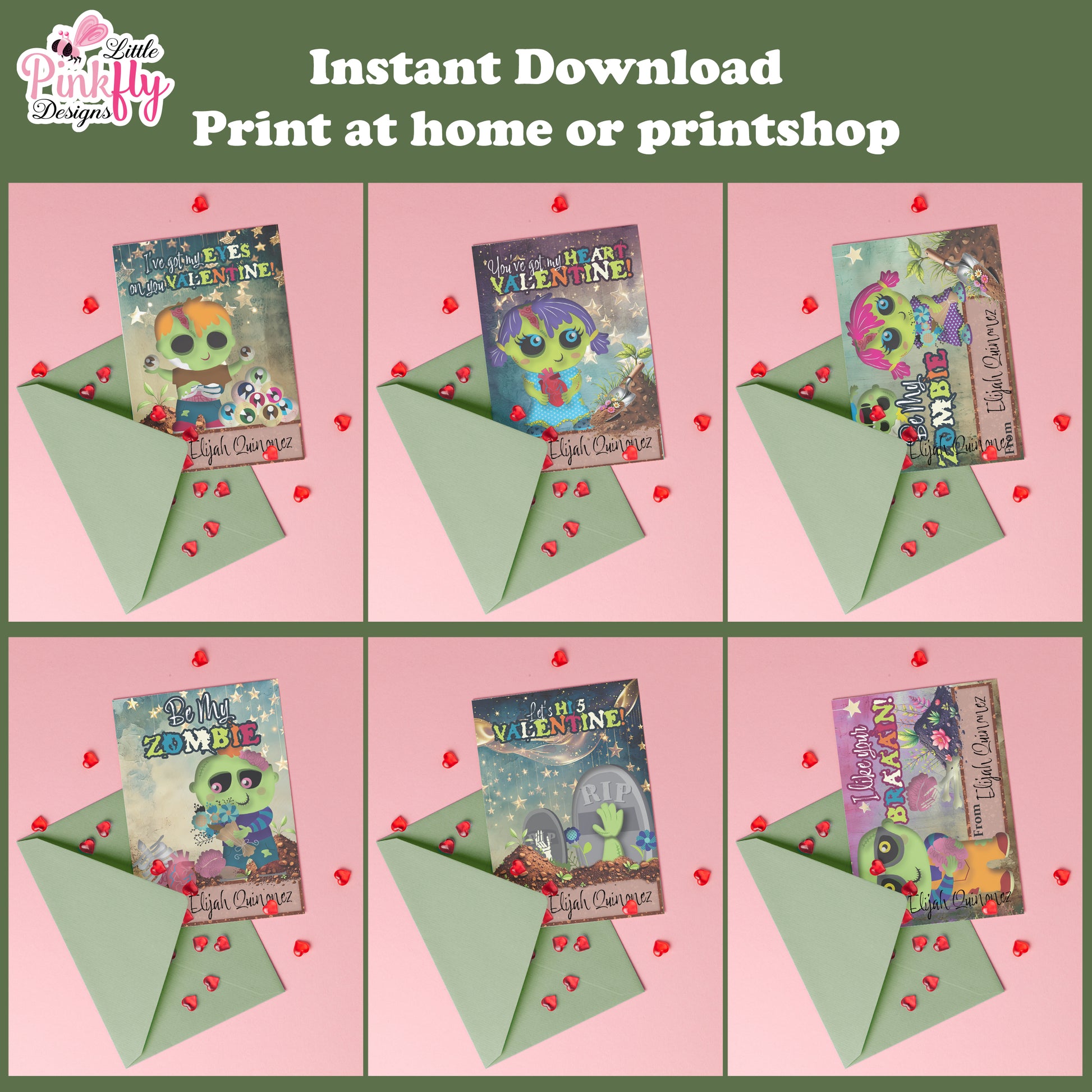 Zombie Valentine Cards – Instant Download Delight your child's classmates with these Zombie -themed valentine cards. This digital collection includes 6 unique designs perfect for Valentine's Day exchanges. Each card measures 2.5 x 3.5 inches and comes as two PDF files: one print-ready file at exact dimensions, plus a second file with bleed and crop marks for professional printing results. Print at home or take files to your local print shop for finished cards. Digital download only—no physical items shipped.